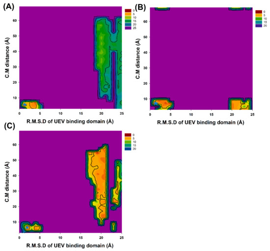 2D PMF profiles of the backbone RMSDs of UEV binding domain (residue numbers: 61–66, 90–100 and 139–145) and the distances between the centers of the two domains (UEV domain protein residue numbers: 61–66, 90–100 and 139–145; the three cyclic peptides): (A) CP1, (B) CP2 and (C) CP3. Stars mark (cyan) is at the lowest PMFs value of 2D PMF profiles.