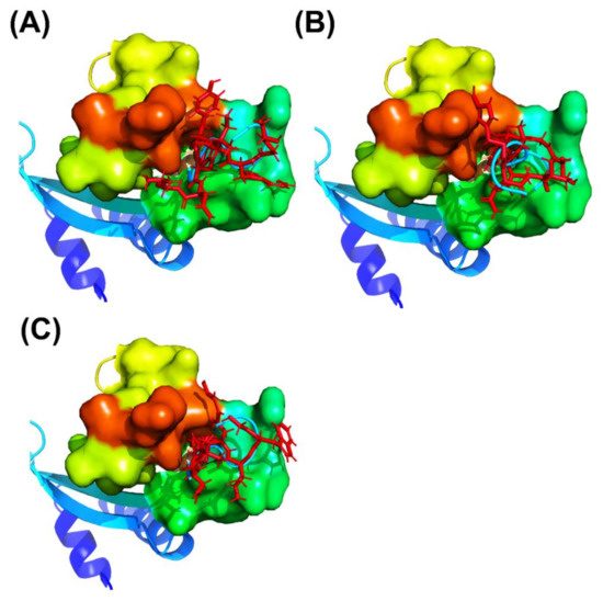 Overview of peptide docking conformations of the three cyclic peptides (cartoon model, cyan) obtained using ClusPro Dock are compared with the complex structures with the GaMD refinement (stick model, red): (A) CP1, (B) CP2, and (C) CP3.