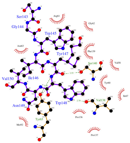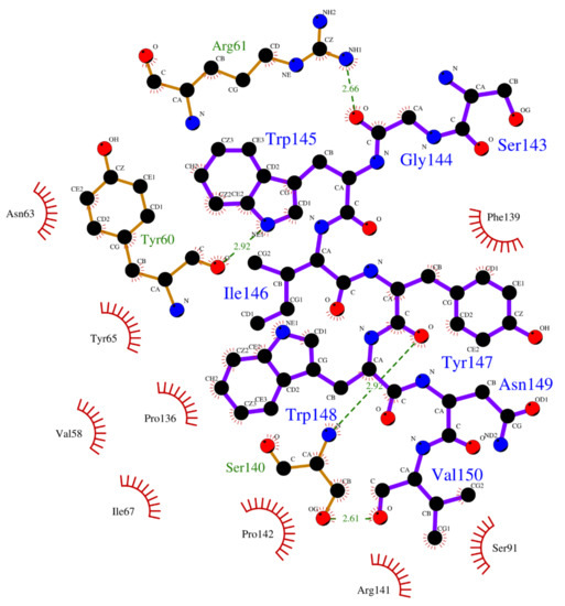 Since the single point residue mutations of peptides might have different 3D conformations and affect the binding affinities with protein receptors [42,43]. The two cyclic peptides (CP2 and CP3) are the single residue mutation of the CP1 peptide. Therefore, we analyzed the binding modes of the cyclic peptides with UEV domain protein and found out the hot-spot residues each the cyclic peptide. Regarding the CP1-UEV domain protein interactions, the residues Gly144, Trp145, and Tyr147 of CP1 can form hydrogen bonds with UEV domain proteins, and residues Trp145, Tyr147, and Trp148 of CP1 can interact with UEV domain proteins via the nonbonding interactions. Regarding the CP2–UEV domain protein interactions, the Gly144 residue of CP2 can form hydrogen bonds with UEV domain proteins, and Trp145, Ser143, and Trp148 residues of CP2 can interact with UEV domain proteins via the nonbonding interactions. Regarding the CP3–UEV domain proteins interactions, our results show that the Tyr147 and Trp148 residue of CP3 can form hydrogen bonds with UEV domain proteins, and Trp145, Tyr147, Ile146, and Trp148 residues of CP3 can interact with UEV domain proteins via the nonbonding interactions. Compared with the three cyclic peptides, the mutation of Tyr147 can reduce UEV domain protein binding abilities. To sum up, the residues Trp145, Tyr147, and Trp148 of the native cyclic peptide (CP1) indeed play essential roles in the cyclic peptides–UEV domain proteins interactions.