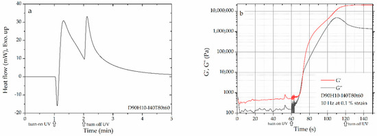 The rheological property of the epoxy systems was determined by the photo-rheometer MCR-302WEPS (Anton-Paar, Graz, Austria), as shown in Figure S6b. The UV source and high-pressure mercury lamp were from Omicure Series2000 (Excelitas Technologies). The rheological properties of the uncured samples were evaluated within the linear viscoelastic region using a parallel plate (PP12-Dispo, d = 12 mm) with a gap between parallel plates of 0.1 mm, frequency of 10 Hz, strain of 0.1%, and isothermal temperature of 80 °C. Each system has been evaluated three times to confirm the repeatability of results. To maintain initial viscosity and initial modulus of the uncured samples, they were held under isothermal condition for 1 min before the curing reaction took place, as shown in Figure 3. The UV curing experiments were performed applying five UV intensities i.e., 10, 20, 30, 40, and 50 mW/cm2 for 1 min.