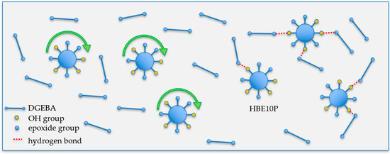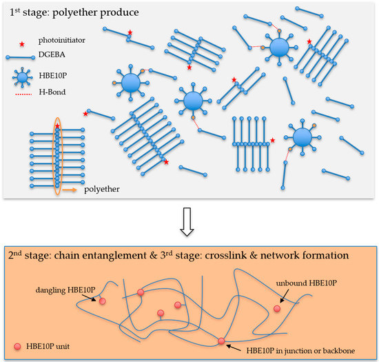 Scheme of UV curing reaction for DGEBA and HBE10P resins.
