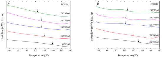 DSC thermograms showing glass transition temperature of (a) DGEBA and (b) D90H10 thermosets cured at various UV intensity.