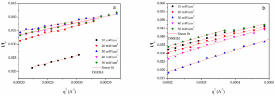 where ξ is the correlation length and I0 is the absolute intensity. A plot of 1/I vs. q2 (Equation (10)) produces 1/I0 (intercept) and ξ2/I0 (slope). At low q, the radius of gyration was evaluated, as shown in Equation (11):