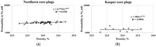 Porosity-N2 permeability cross-plot for the Nordhorn (a) and Keuper core plugs (b).
