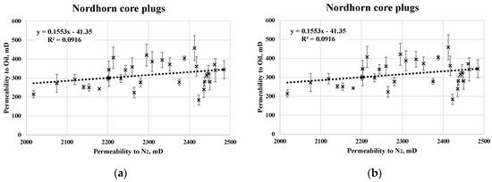 Cross-plot of permeability to gas and oil without outliers for the Nordhorn (a) and Keuper samples (b).