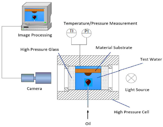 Contact angle measurements were performed using a high pressure view cell (HPVC) 40-MD (Novis DN15, PN40; maximum operating conditions (Pmax/Tmax): 40 bar/200 °C). A piston accumulator was connected to the inlet of the cell for the injection of a heavy fluid “alkali–polymer/alkali/brine/polymer” and pressure exertion. On the bottom of the view cell, a capillary that dispenses oil was connected (16 TH/St.Ulrich) for the analysis of the contact angle. The cell was exposed to a light source to enable camera recording on the other side of the cell for taking high-contrast images. The temperature inside the view cell was controlled with a fluid-circulated heating jacket. The fluid temperature was monitored using a thermocouple (thermocouple type K with resolution of 0.1 K and accuracy of ±1 K).