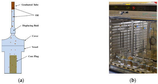 Schematic representation of the Amott imbibition cell (a) and the set experiments placed in the oven (b).