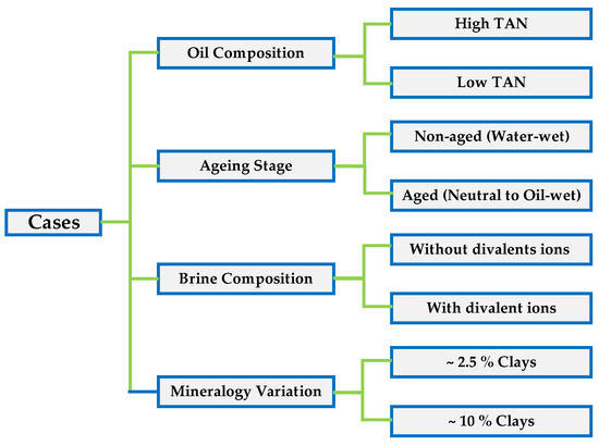 To better structure the evaluation and gathering of data, we set different scenarios which allowed us to cross-analyze and understand the effects of each parameter: (1) total acid number of the oil; (2) the influence of core plug aging; (3) changes in brine composition; and (4) variation in mineralogy (clay%). A schematic representation of the cases is shown in Figure 6. Experiments were conducted a minimum of two times to assess the uncertainty range related to the test procedure. The error bars shown in the diagrams represent the measurement uncertainties.