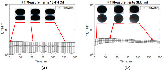 The reported data are in good agreement with those previously reported by Leitenmüller et al. [32], Schumi et al. [16], and Neubauer et al. [33], considering that all these data were measured in different periods. Each of the experiments (the tested kinds) is described in detail using images of the droplet sizes and the measured IFT over time during the same periods (see from Figure 7, Figure 8, Figure 9, Figure 10 and Figure 11). In Figure 7, it can be observed that in the case of both high and low TAN oils, the effect of alkali on lowering interfacial tension is clear. However, the decrease in IFT for high TAN oil is more significant, and the final equilibrium value reaches a low IFT in the range of 0.05 mN/m. For all cases, the measured values of interfacial tension between the oils and test water stay constant over time, ranging between 1 and 3.5 mN/m for high TAN oil and 2 to 4.5 mN/m for low TAN oil.