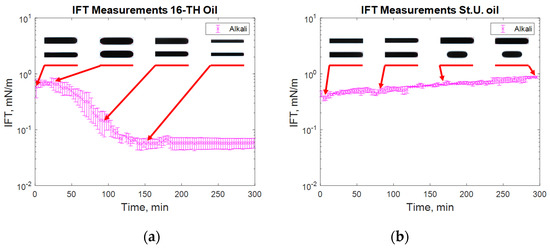 For alkali solutions (Figure 8), very different behavior was observed for both high and low TAN oil. First, the instantaneous IFT for the high TAN oil reached very low values. As soon as the experiment started, the droplet quickly elongated, showing small interfacial tension. After a few minutes, the droplet started to shrink again, increasing the IFT until it reached a peak. After passing the highest value, the IFT started to decrease again, reaching equilibrium at a value of around 0.05 mN/m. Similar behavior of interfacial tension was observed by Sharma et al. [18]. Using low TAN oil led to a different outcome. The initial low value of IFT monotonically increased over the 300 min of investigation with an almost linear trend. Such results can be explained by the interactions between the alkali and natural acids of the oil.