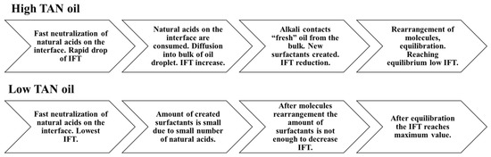 Schematics explaining the process of IFT change for high and low TAN oils.