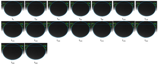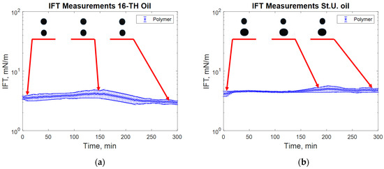 During the interfacial tension measurements with polymer solutions, no significant changes in oil droplet shape were observed, as can be seen from Figure 10. Compared to the test water, a slightly higher interfacial tension was measured. The uncertainty range of the evaluated data could be related to the chosen measurement algorithm or the devised stabilization. Nevertheless, taking the average value of IFT can offer a reliable approximation for an oil–polymer system.