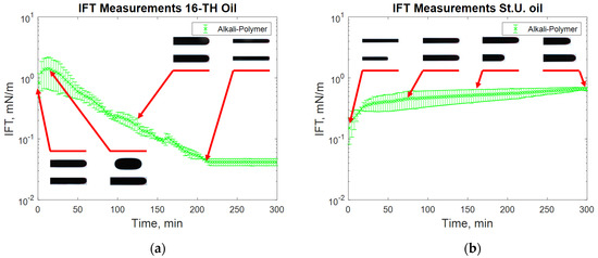 IFT measurement for high TAN (a) and low TAN oil (b) with the alkali–polymer at 60 °C (alkali: 7 g/L Na2CO3; polymer: 2000 ppm FLOPAAM 3630S).