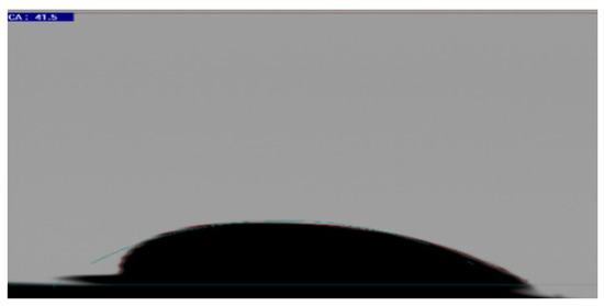 The contact angle results illustrated a water-wet state of both core plugs prior to the aging process, as shown in Table 6. The contact angle values were measured over time intervals of 20 min, as shown in Figure 12. As predicted based on our previous work [34,39,40,41], there was no change in the contact angle due to the strong hydrophilic characteristics of the porous media. However, the aging process altered the rock surface, which became hydrophobic, resulting in oil polar compounds attaching to the rock surface. The wettability alteration to oil-wet (shown in Figure 13), based on our previous work [35,42], confirmed the change in contact angle to 41. The wettability alteration of the Berea and Bentheimer sandstone core plugs through a two- or three-week aging process has also been established by many researchers [43,44,45,46,47]. On a similar note, we suspect that the aging process of the core plugs in this study changed the wettability to mix-wet or oil-wet, especially for the Keuper core plug with higher clay content.