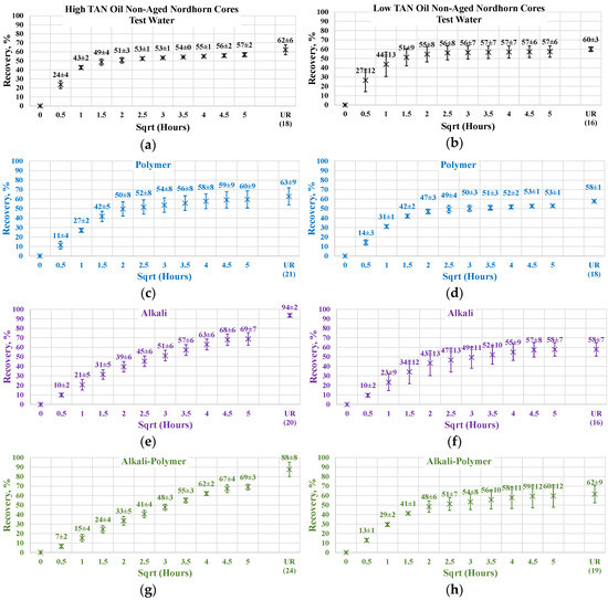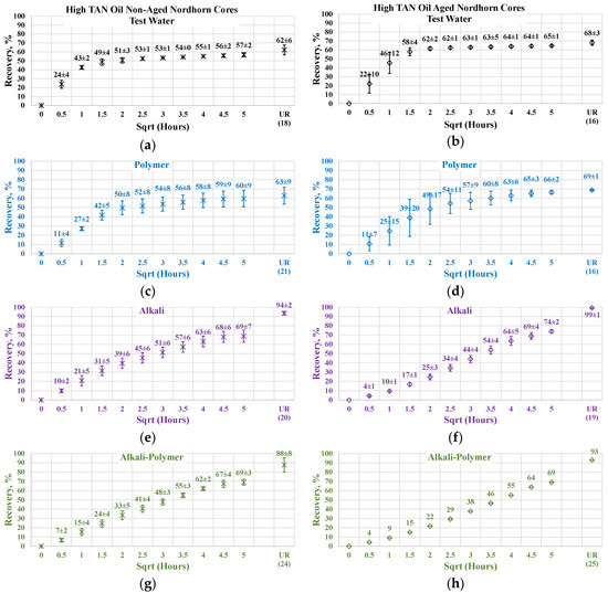 Percentage of production versus the square root of the time plot for non-aged and aged Nordhorn core plugs saturated with high TAN oil (water composition comparison) at 60 °C (alkali: 7 g/L Na2CO3; polymer: 2000 ppm FLOPAAM 3630S). Data of non-aged cores (a,c,e,g) are presented on the left side whereas aged core data (b,d,f,h) on the right side. Black-colored data refer to test water (saturated core) imbibed by test water, red-colored data refer to formation brine (saturated core) imbibed by test water, green-colored data refer to test water (saturated core) imbibed by alkali-polymer, and blue-colored data refer to formation brine (saturated core) imbibed by alkali-polymer. Ultimate recovery (UR) refers to recovered oil divided bv Soi.