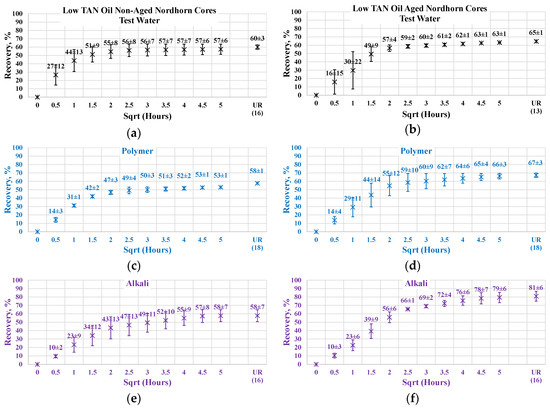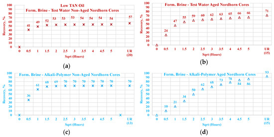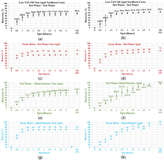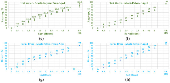 Percentage of production versus the square root of the time plot for non-aged and aged Nordhorn core plugs saturated with low TAN oil (water composition comparison) at 60 °C (alkali: 7 g/L Na2CO3; polymer: 2000 ppm FLOPAAM 3630S). Data of non-aged cores (a,c,e,g) are presented on the left side whereas aged core data (b,d,f,h) on the right side. Black-colored data refer to test water (saturated core) imbibed by test water; red-colored data refer to formation brine (saturated core) imbibed by test water; green-colored data refer to test water (saturated core) imbibed by alkali-polymer, and blue-colored data refer to formation brine (saturated core) imbibed by alkali-polymer. Ultimate recovery (UR) refers to recovered oil divided bv Soi.