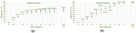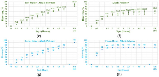 Percent of production versus the square root of the time plot for the Nordhorn non-aged and aged core plugs saturated with high TAN oil at 60 °C (alkali: 7 g/L Na2CO3; polymer: 2000 ppm FLOPAAM 3630S). Non-aged core data (a,c,e,g) are presented on the left side whereas aged core data (b,d,f,h) on the right side. Black-colored data refer to Test water, Blue-colored data refer to polymer, purple-colored data refer to alkali, and green-colored data refer to alkali-polymer. Ultimate recovery (UR) refers to recovered oil divided bv Soi.