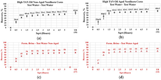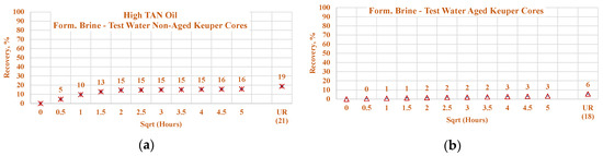 The comparison of aged and non-aged Nordhorn core plugs is shown in Figure 18 for high TAN oil and in Figure 19 for low TAN oil. For the observations obtained in this work, when the core plug was placed into the test water after saturation, the composition of the formation brine did not play a large role. As can be seen from Figure 18a, the oil production profile followed the same path for both the formation brine and test water’s initial saturation in the case of aged and non-aged cores.