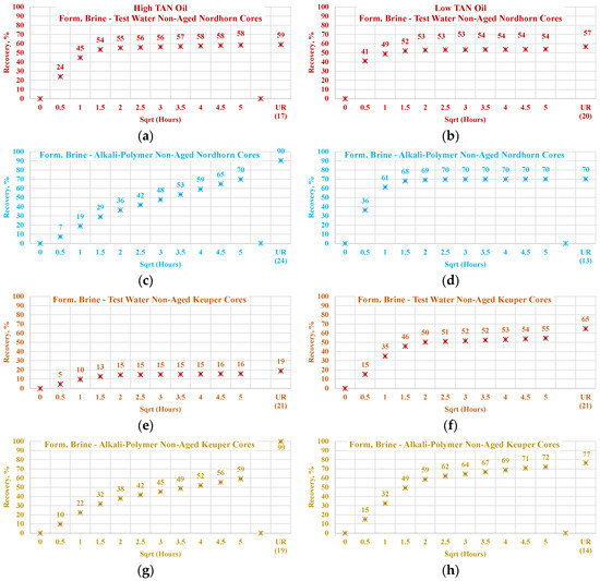 Percent of production versus square root of time plot for non-aged Nordhorn and Keuper core plugs for high TAN oil (a) and low TAN oil (b) at 60 °C (alkali: 7 g/L Na2CO3; polymer: 2000 ppm FLOPAAM 3630S). High TAN oil data (a,c,e,g) are presented on the left side whereas low TAN oil data (b,d,f,h) on the right side. Nordhorn cases are presented from (a) to (d), whereas Keuper cases are presented from (e) to (h). Red-colored data refer to formation brine (saturated core) imbibed by test water; blue-colored data refer to formation brine (saturated core) imbibed by alkali-polymer; orange-colored data refer to formation brine (saturated core) imbibed by test water, and mustard-colored data refer to formation brine (saturated core) imbibed by alkali–polymer. Ultimate recovery (UR) refers to recovered oil divided bv Soi.