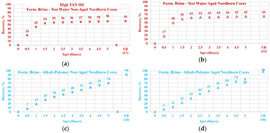 Percentage of production versus the square root of the time plot for Nordhorn core plugs (non-aged and aged), saturated with high TAN oil at 60 °C. Alkali: 7 g/L Na2CO3, Polymer: 2000 ppm FLOPAAM 3630Ss. Data of non-aged cores data (a and c) are presented on the left side, whereas aged cores data (b and d) on the right side. Red-colored data refer to formation brine (saturated core) imbibed by test water; blue-colored data refer to formation brine (saturated core) imbibed by alkali–polymer. Ultimate recovery (UR) refers to recovered oil divided bv Soi.