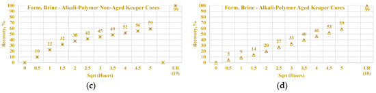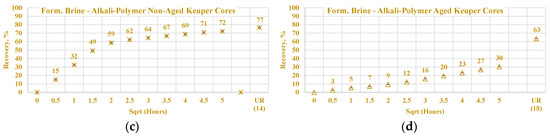 Percentage of production versus the square root of the time plot for Keuper core plugs (non-aged and aged), saturated with low TAN oil at 60 °C. Alkali: 7 g/L Na2CO3, Polymer: 2000 ppm FLOPAAM 3630Ss. Data of non-aged cores data (a and c) are presented on the left side, whereas aged cores data (b and d) on the right side. The orange-colored data refer to formation brine (saturated core) imbibed by test water and the mustard-colored data refer to formation brine (saturated core) imbibed by alkali-polymer. Ultimate recovery (UR) refers to recovered oil divided bv Soi.