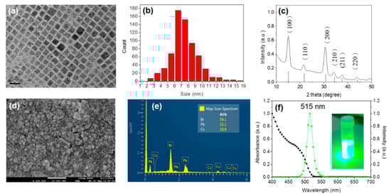 - Yu, H.; Tian, G.; Xu, W.; Wang, S.; Zhang, H.; Niu, J.; Chen, X. Green light-emitting devices based on perovskite CsPbBr3 quantum dots. Front. Chem. 2018, 6, 381. [Google Scholar] [CrossRef]