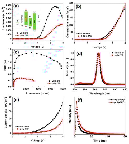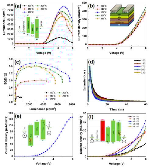 - Chao, S.W.; Chen, W.S.; Hung, W.Y.; Chen, Y.Y.; Lin, Y.M.; Wong, K.T.; Chou, P.T. Cross-linkable hole transporting layers boost operational stability of high-performance quantum dot light-emitting device. Org. Electron. 2019, 71, 206–211. [Google Scholar] [CrossRef]