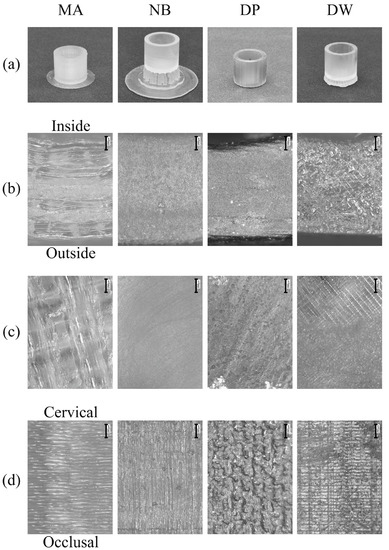 The exterior views are shown in Figure 2a. A raft was created around MA to ensure adhesion to the modeling platform. Some supports were created between the patterns and modeling platform to prevent the occlusal surface from directly touching the platform in NB and DW. On the cervical and ceiling surfaces of MA, imprints of the melted filaments were observed (Figure 2b). In contrast, a grid pattern, which could be attributed to laser scanning, was visible on the cervical and ceiling surfaces of DW (Figure 2c). Moreover, on the marginal surface of MA and DW, laminated layers were observed, but no such layers were found on NB and DP (Figure 2d) [23].
