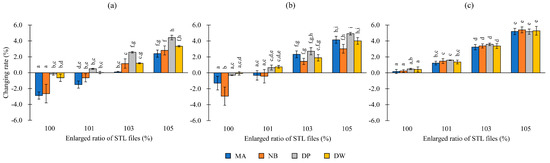 Changing rates (%) of patterns fabricated by each 3D printer. (a) Outer diameter; (b) inner diameter; (c) depth. The superscripts with the same letters indicate combinations that are not significantly different (p > 0.05).