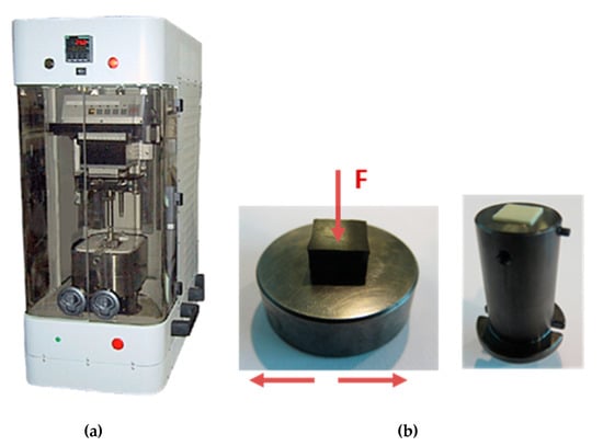 The tests were performed on a CETR-UMT tribometer using a polymeric pin oscillating at a constant frequency (5 Hz), a stroke amplitude (4.25 mm) and under a defined load (384 N), against a stationary steel test disc under dry conditions for 1800 s. The sliding speed was 42.5 mm/s. A scheme of the testing configuration is shown in Figure 1.
