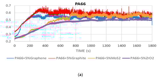 Lower values of CoF are achieved with ZrO2, graphene and MoS2 in the case of the PA66 (Figure 2a) composites, obtaining values of 0.49, 0.52 and 0.53, respectively. PA66 samples doped with graphite have higher CoF values (μ = 0.59). Regarding PA46 composites, lower values of CoF are achieved for samples doped with MoS2 (μ = 0.45). PA46 samples (Figure 2b) doped with graphene show a CoF value of 0.5, and those doped with graphite and ZrO2 have higher friction coefficients (μ = 0.57 and 0.58, respectively). In the case of PA12-based composites (Figure 2c), almost all the samples show lower CoF values than the rest of the composites for each additive. The low values of CoF achieved for samples doped with MoS2 (μ = 0.41) are remarkable.