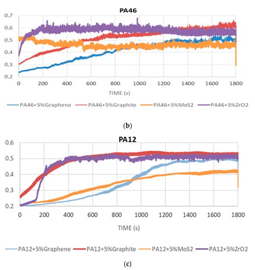 CoF evolution for composites based on (a) PA66, (b) PA46, and (c) PA12.