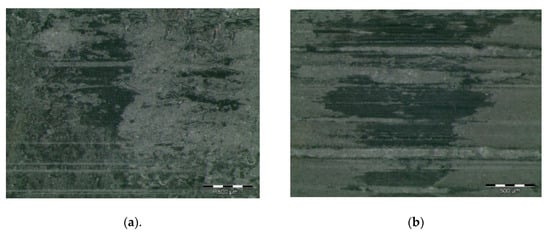Figure 3 shows worn surfaces of pins based on a PA66 matrix. A top layer disintegration is observed in Figure 3a,b for samples doped with graphene and graphite. Removed material appears in the form of blocks, indicating an adhesive wear mechanism. Figure 3a shows a smoother worn surface, which reveals that the graphene particles strongly protect the top of the composite material surface under dry sliding test conditions. There is not any significant crack formation, broken particles or wedge formation, which means good bonding between the graphene filler and the matrix material. Graphene particles become integrated in the PA66 composites and, consequently, the worn surface is protected from the wear and friction. This may be due to the excellent self-lubricity of graphene that reduced the friction and the wear of the polymer composites []. Figure 3b shows the back transfer of the material in a patchy form, indicating an adhesive wear, as well as some mild abrasive wear with shallow grinding marks. Nevertheless, the severity of the wear mechanism is reduced due to the presence of graphite. The bonding strength of graphite is appreciable on the surface of the composites, indicating the migration action and the layer formation of graphite with a polymeric matrix, although weak wear track formation is also visible [,].