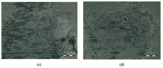 Similar to samples of PA66 doped with graphene and graphite, an adhesive wear mechanism is activated for PA46 pin surfaces, as shown in Figure 5a,b, exhibiting removed material from the surface in the form of blocks. Regarding samples doped with MoS2, in Figure 5c, transverse cracks, spaced unevenly, are seen across the wear surfaces of the PA46 + MoS2 samples as well as the formation of polished surfaces and areas of melting, indicating a severe adhesive wear. Tensile stresses produced in the contact area and the high surface temperatures created play a significant role in the crack formation. These worn surfaces reflect some typical fatigue deformations with deep cracks and compact furrows. Figure 5d shows local plastic deformation in the contact area for samples of PA46 doped with ZrO2, confirming an adhesive wear mechanism.