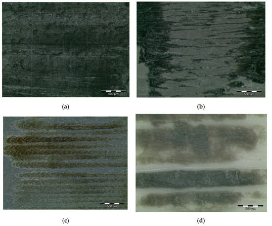 Worn surfaces of PA12 composites: (a) PA12 + 5% graphene; (b) PA12 + 5% graphite; (c) PA12 + 5% MoS2; (d) PA12 + 5% ZrO2.