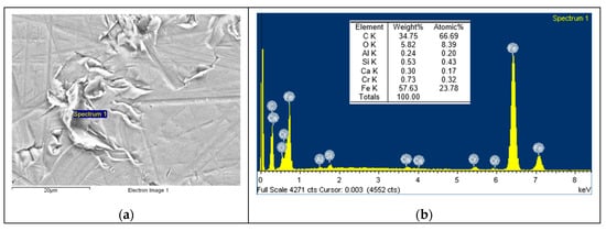 (a) SEM image and (b) EDS spectrum for discs tested against the PA46M sample.