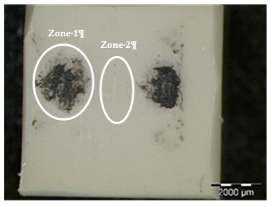 The negative wear values obtained in the tests and shown in Table 2 could be attributed to the transfer of metallic particles of the 100Cr6 disc to the polymeric pin. The dark colour in Figure 5d also could indicate the presence of steel material from the counterface. Since PA46Z samples show the highest negative mass loss, they were subjected to a further analysis of their surface and composition by means of SEM and EDS. Figure 12 shows the surface aspect of a pin on which two different zones, representative of the main wear mechanism produced in the pin surface, were analysed (zone 1 and zone 2). These two different zones are selected for further analysis because the contact of the pin against the counterface is not exactly the same at zone 1 and zone 2, as can be appreciated in Figure 12. Since the sample pin surfaces are not entirely flat and the pin could not be properly aligned during the test, zone 1 and 2 do not contact in the same way against the counterface, and they should both be studied.