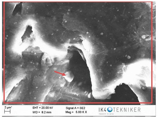 Secondly, the presence of nanoadditives in polymeric matrices prevents crack propagation generated during the sliding process, thanks to the efficient stress transfer from the polymer matrix to the nanoadditives, leading to a mild wear mechanism []. On the other hand, according to [], a material can be worn in a chemical and/or mechanical way, and the heat generated during the wear process can contribute to it. In the case of MoS2 particles, Mo atoms can become oxidised to MoO3, and S atoms can become oxidised and react with the Fe substrate, turning into FeS. This enhances adhesion between the counterpart and the transfer film and prevents its loss, improving the wear properties of the MoS2 composite [].