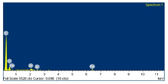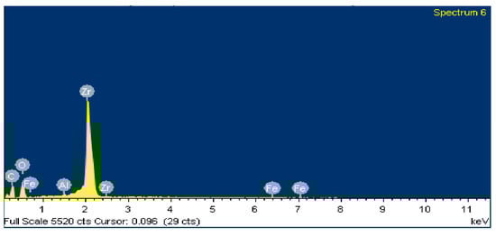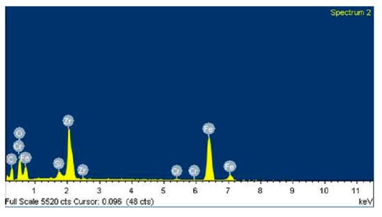 EDS spectrum of the marked area in Figure 19, where traces of ZrO2 appear.