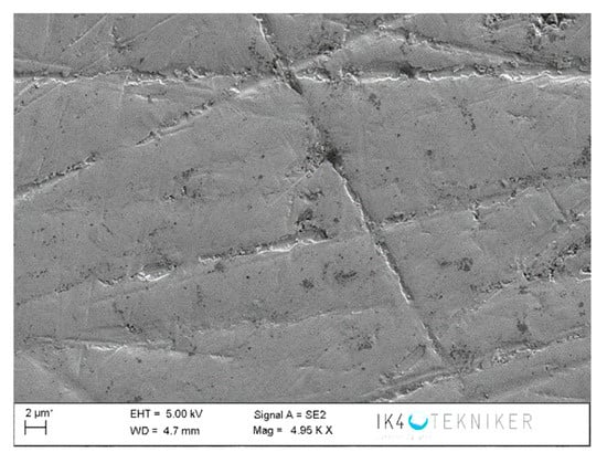 One of the challenges that has arisen during recent years in the industrial field is to make industrial processes and component performance more sustainable. In this sense, one of the most used industrial components is bearings, so improving their energy efficiency may be key to reduce fuel consumption and pollutant emissions. As an example, recent analyses [] show that for every litre of fuel used in an average vehicle, 5% is consumed in mechanical losses and 1% of the total is lost due to bearing operation. Since a significant part of the energy required for industrial component performance is lost in form of heat due to friction [], new strategies are required to develop low-friction components. Traditionally, these strategies have been focused on modifying surfaces through different treatments to improve surface hardness [,], or to develop hard coatings deposited by physical [] or chemical vapor deposition (PVD and CVD) [], and the development of new lubricants []. However, some friction and wear phenomena are characterised by different scale processes (ones at atomic or molecular scales and others at a scale of roughness of approximately 1–20 μm []) that operate simultaneously. This fact leads to difficulties in studying microscopic phenomena resulting in macroscopic wear and friction and becomes one the biggest challenges of current tribology research. Furthermore, problems related to coating detachment can arise because adherence properties strongly depend on the morphology and composition of the coating layer [], and also on the interacting forces between the coating layers and the substrate surface. Therefore, the development of new self-lubricant materials without coating requirements seems to be an excellent solution to achieve low-friction properties, minimising maintenance costs due to the presence of additional lubricants.
