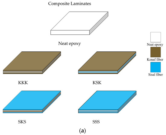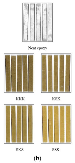 The neat epoxy and epoxy composites were prepared as follows [26]. For the preparation of the neat epoxy system, the epoxy resin was mixed with the hardener in a 100:35 ratio at room temperature and poured into the mold with a dimension of 300 × 300 mm2 and a thickness of 3 mm. The samples were cured at room temperature for 24 h, followed by post-curing at 80 °C for 24 h. For the preparation of epoxy composites, first, the fiber fabrics were dried at 60 °C for 24 h in an air oven and then cut it to fit in the mold size of 300 × 300 mm2. Second, the epoxy/hardener mixture was prepared. Third, the three layers of the fabric were placed in the mold and were applied with the epoxy hardener mixture by hand layup method. This was followed by curing at room temperature for 24 h, followed by post-curing at 80 °C for 24 h. Irrespective of the composites, the fiber volume fraction used was ~18%. The average standard deviation in thickness of the prepared composites varies between 0.02 to 0.15 mm. The cured samples were later cut into small size for testing using a diamond-tipped saw cutter based on ASTM standards. Before testing, sandpaper was used to remove the defects and to make the samples more uniform. The schematic of the prepared samples and the photographs of the cut samples (before the application of sandpaper) is given in Figure 2a,b.