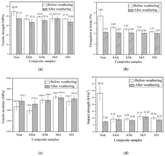 The (a) tensile strength, (b) elongation at break, (c) tensile modulus, and (d) impact strength of epoxy composite before and after weathering.