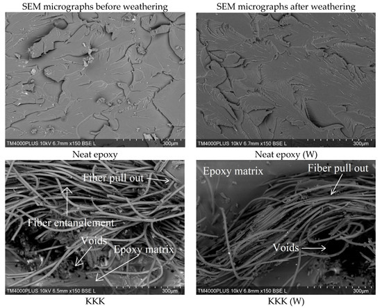The SEM micrographs of the tensile fracture surface of the neat epoxy system and its composites before and after aging studies are shown in Figure 4. The neat epoxy system irrespective of the aging studies showed river like brittle fractures throughout the epoxy matrix. SEM micrographs of the composites before aging studies show lack of epoxy resin adhesion to fibers, with multiple fiber pull out, fiber entanglement, and voids. The poor interfacial adhesion between the fiber and the epoxy matrix is because of the unfavorable interactions caused by the moisture absorption of the fabric and the void formation during the fabrication of composites. Thus, it can be substantiated that the drop in mechanical properties of the fiber-reinforced composites is due to the poor interfacial adhesion between the fiber fabric and the epoxy matrix [32]. On the other hand, the SEM micrographs of the composites after aging studies show more fiber pullout and larger void formation irrespective of the stacking sequence. This suggests deterioration in interfacial adhesion between the polymer and fabric due to the matrix degradation. Thus, the drop in the mechanical properties of the composites after the accelerated weathering is due to the epoxy matrix degradation caused by the accelerated weathering.