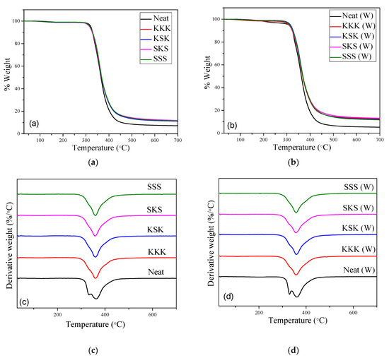 The thermogravimetric analysis of the neat epoxy, individual composites, and hybrid composites before and after weathering studies is shown in Figure 5a,b. The onset decomposition temperature (Ton), final decomposition temperature (Tf), and maximum decomposition temperature (Tmax) obtained from the thermogram are given in Table 2. The main degradation of the neat epoxy, individual composites, and hybrid composites is due to the epoxy chain scission at high temperatures [35]. The Ton, Tmax, and Tf values of composites before weathering are stable with only marginal changes with the incorporation of fiber fabrics. Similarly, irrespective of the introduction of the fibers, fiber type, hybridization, and stacking sequence, the neat epoxy and epoxy composites show no major change in the values of Ton, Tmax, and Tf after the weathering test. These results prove that the composites are thermally stable before and after the weathering test. It is important to point out that the neat epoxy system and composites show two peaks: a shoulder and the main peak in the DTG curve (Figure 5c,d). The shoulder is due to the decomposition of lower molecular weight sites and while the main peak is the decomposition of highly crosslink density sites of epoxy matrix [36].