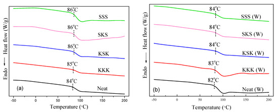The Tg of neat epoxy, individual composites, and hybrid composites before and after weathering studies has been studied. The DSC thermogram of the composites is shown in Figure 6. The Tg of neat epoxy is observed at 84 °C, and this value marginally increased to higher temperatures for the individual and hybrid composites. The increase in Tg may be due to the restriction in the mobility of the polymer chains caused by the fiber fabrics [37]. On the other hand, the Tg is marginally reduced after the aging studies, which may be due to the polymer degradation caused during the weathering studies.