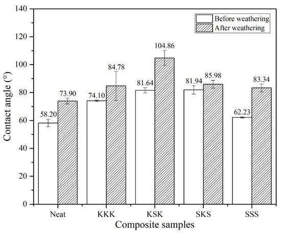The contact angle values are a measure of the hydrophilicity/hydrophobicity of the composites. It gives information on the surface properties and wettability of the polymer surface. The superhydrophobic surface (contact angle greater than 150°) repels water and reduces the water absorption. Similarly, if the contact angle is less than 10°, the composite will be superhydrophilic with higher wettability and good self-cleaning ability [38,39,40]. For outdoor applications, the composite structures are usually coated with paint, and for coating hydrophilic surfaces are preferred. The comparison of the contact angle measurements of neat epoxy, individual composites, and hybrid composites before and after weathering composite samples is shown in Figure 7. The neat epoxy system shows a contact angle of 58°, typical for a hydrophilic material, and water can easily spread over it. However, the composites show higher contact angle values, and the maximum contact angle was observed for SKS composites but still in the hydrophilic range. This shows that the interaction between the water and epoxy surface became less in composites compared to the neat epoxy polymer. The contact angle depends on the surface roughness of the composites. The surface of the neat epoxy system is smooth, while the surface of the composites is rough due to the presence of fabrics at the composite surface and that is probably the reason for the increase in contact angle values of the composites. Interestingly, the contact angle value further increases for all the samples after the weathering test. These results are in agreement with our previous study [26]. The increase in contact angle is due to the surface roughness of the composites due to the surface degradation caused during the accelerated weathering. The maximum contact angle is shown by weathered KSK hybrid composite (104.86°) and shows a hydrophobic behavior. That means the water droplets may roll over KSK surface rather than spreading or wetting.