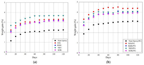 The water absorption behavior of the neat epoxy, individual composites, and hybrid composites before and after weathering composite samples was studied up to 120 days. The water absorption behavior of the composites before and after weathering is shown in Figure 8. In the initial days of the experiment, the water absorption increases rapidly, followed by a slowdown and then a plateau region [41]. The weight gain is minimum for the neat epoxy system and is ~2%. However, for composites, it is more than 3%. This is due to the presence of fiber fabrics in the epoxy matrix. The voids generated at the fabric/matrix interface, crack formation in the matrix, hollow structure of fibers, and the hydroxyl functional groups present in the fibers influence the water uptake of the composites [26,41,42]. After weathering, the water absorption of the neat epoxy system increases from ~2% to ~3%, which may be due to the formation of the microcracks in the matrix, and thus water enters through the microcracks and water absorption increases. Similarly, the composites also show higher water absorption from ~3% to 4% and above. The formation of microcracks and the degradation of fibers created new path for water transport and hence higher water absorption. Thus, one of the limitations of using fiber fabric-based epoxy composite is its water absorption properties.