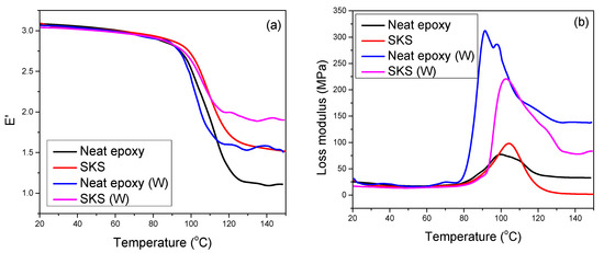 The loss modulus profile of the neat epoxy system and SKS composite is shown in Figure 9b. The SKS composites (before weathering) show a marginal improvement in Tg with the incorporation of fiber fabric. The neat epoxy system after the weathering test shows lower Tg and higher loss modulus peak height. The high loss modulus peak values showed that the intermolecular bonding is destroyed during the accelerated weathering test [45]. It is worth to mention that for SKS composite the Tg was not affected with the accelerated weathering test; moreover, the loss modulus peak height is lower when compared with neat epoxy system showing that the fiber fabrics prevent the degradation of the epoxy matrix at the macro-level.