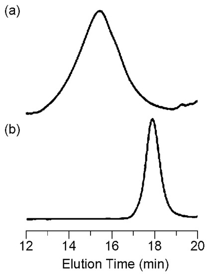 1H and 13C NMR spectra were recorded at 25 °C on a Bruker model AC-500 spectrometer (Bruker, Billerica, MA, USA), operating at 500 and 125 MHz, respectively, where chemical shifts (δ in ppm) were determined with respect to non-deuterated solvent residues as internal standards. Analytical size exclusion chromatography (SEC) was performed in tetrahydrofuran (THF) at 40 °C, using 8.0 mm × 300 mm gel columns (Shodex KF-804 × 2) on a TOSOH model DP-8020 (TOSOH, Tokyo, Japan) with an RI-8022 RI detector (TOSOH, Tokyo, Japan). The number-average molecular weight (Mn) and polydispersity ratio (Mw/Mn) were calculated from the chromatographs with respect to 15 polystyrene standards (Scientific Polymer Products, Inc., Ontario, NY, USA; Mn = 580–670,000, Mw/Mn = 1.01–1.07). Elemental analyses were recorded on a Yanaco CHN CORDER MT-5 instrument (Yanaco, Tokyo, Japan). UV-vis spectra were recorded using a quartz cell of 1 cm path length on a SHIMADZU Type UV-2550 spectrometer (SHIMADZU, Kyoto, Japan).