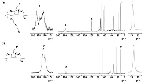 13C NMR spectrum of (a) poly(DEGV-alt-EtMI) and (b) polyEtMI in CDCl3.